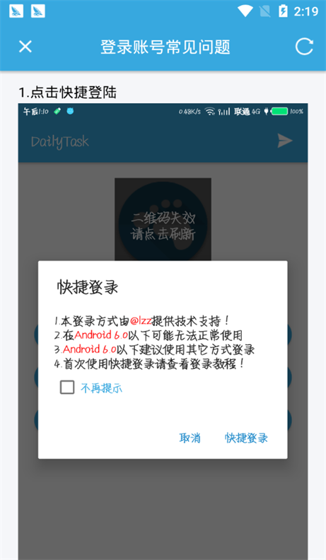 dailytask安卓版是提供qq签到和各种活动签到的辅助应用工具,不仅体积十分小巧,界面也高清简单,功能丰富,一键解放双手,快速打卡签到,领取福利,帮助用户快速升级,还有登陆教程使用,小白也可以轻松上手,十分方便!