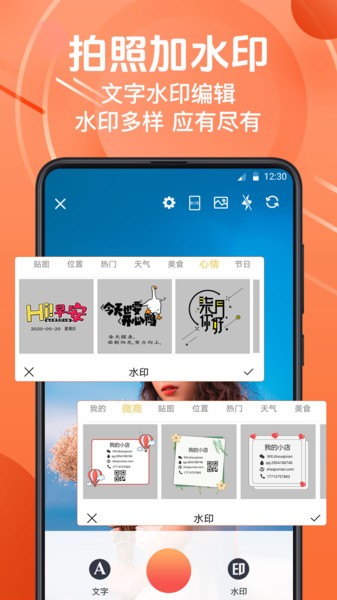 天气、地点、时间、智能水印自动添加到照片上;个性DIY自定义微商水印,防盗图做宣传必备,支持上传自己的logo。