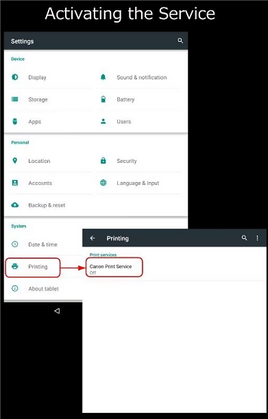 -- 点击[设置] > [打印] > [Canon Print Service],然后在显示的设置屏幕中激活该服务。