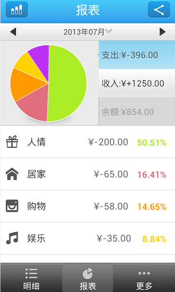 包括当月各类型账目占比的饼状图和当月收入和支出对比的柱状图开发者应用
