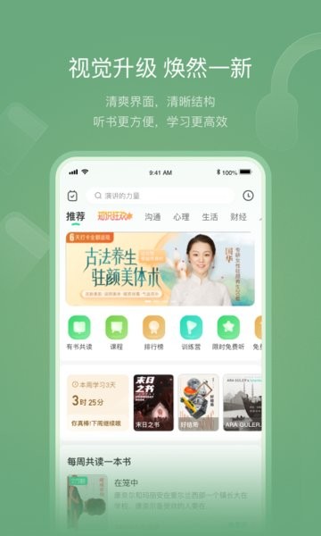 App里还有超多听书资源,20分钟精读一本好书的精髓,这对于像我这样经常没时间看书的人来说真的太方便了。比如《财务自由之路》《婚姻书》这些实用类书籍,边听边做家务 totally没问题。而且更新日志里还提到可以离线观看视频章节,以后坐地铁也能听课了。