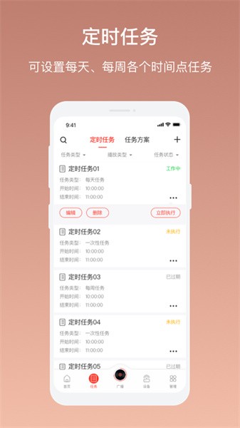 任务-查看当前账号设定的定时任务信息及对任务的添加、编辑、删除操作 广播-可对账号下的设备进行文本、音乐、录音、口播、电台转播操作 设备-对账号下设备进行管理,运维安装等操作