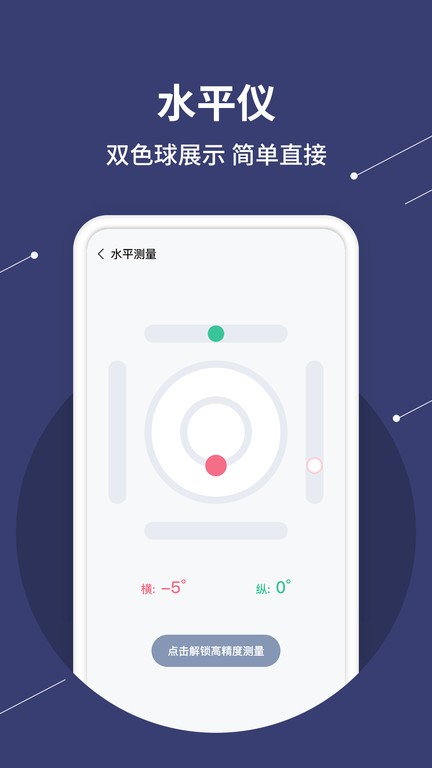 水平仪测量安卓版适用于测量角度和测量表面水平程度。您可以在装饰家居,摆放相框,衡量一个斜面的角度,测量墙体垂直度的时候,水平仪是集多种小工具于一体的工具箱,是合适的家庭小工具箱。