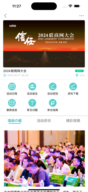 2、新增活动板块,活动增加日程、报名、签到、资料下载、展商信息等功能