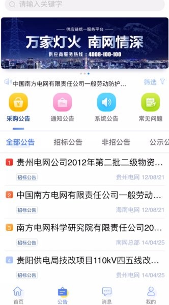 点击底部导航栏“公告”栏目打开公告页面,查看南方电网招标采购相关公告及相关的管理规范。