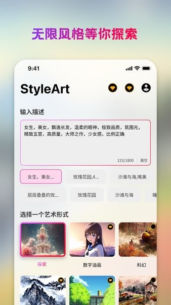 将文字变成迷人的数字艺术作品!你只需要输入一个提示语,选择一种艺术风格――然后看着Styleart在几秒钟内将你的想法变成现实!