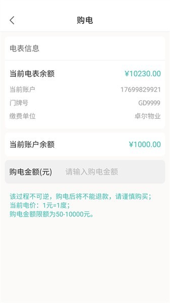 用户在进行电表购电前需要对电表进行绑定,绑定的电表需为卓尔物业旗下的电表。绑定后电表支持解绑删除操作,支持电表余额实时查看。