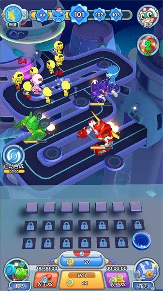 1、必须战略性地放置超人,选择最合适的技能,去阻挡霍哈哈、大大怪他们带来的一波波来袭的敌人。