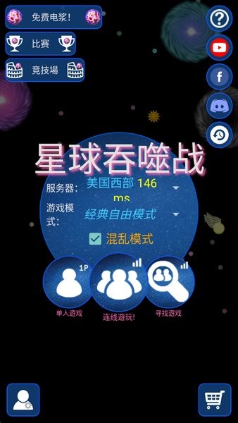 1、进入游戏:在界面下选择服务器,自己在那个区域就选哪。游戏模式,分为FFA,队伍,生存,足球赛,统治等模式。黄色的mayhem模式是加强版,选择以后游戏场景中会添加旋转障碍物以及道具等,更加刺激。再下方选择单人游戏还是多人游戏,左侧1P是单人,打的是电脑,中间三个人头是多人联网,和真人对战!