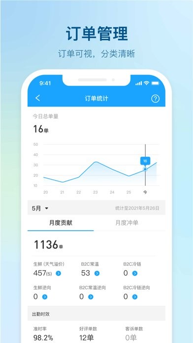 管理自己的每一笔订单,了解订单情况,提高整个订单的配送效率。
