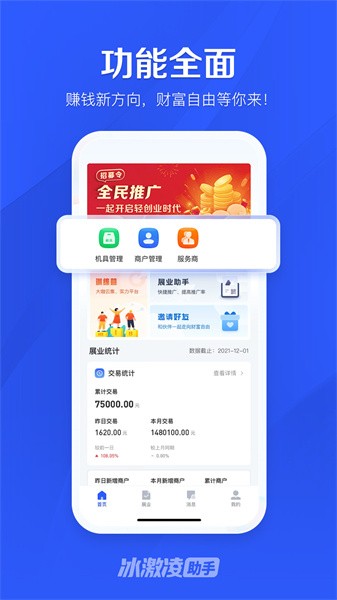冰激凌助手是专为服务商设计打造、协助服务商进行推广扩展的移动工具。让服务商可以享受一站式运营管理体验,包括机具管理、实时监控等实用功能,还进一步提供大数据分析,数据可视化等运营功能,全面服务服务商展业需求。