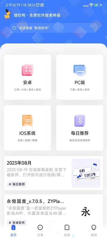 搜软鸭官方版是提供安卓资源、ios资源、pc端资源的应用工具箱,分类清晰,各种软件随你体验,精选推荐,包括tv应用、图像壁纸、娱乐有趣、学无止境、实用工具、小说漫画、影视软件、磁力下载、音乐视听等等,还提供标签功能,使用方便简单!
