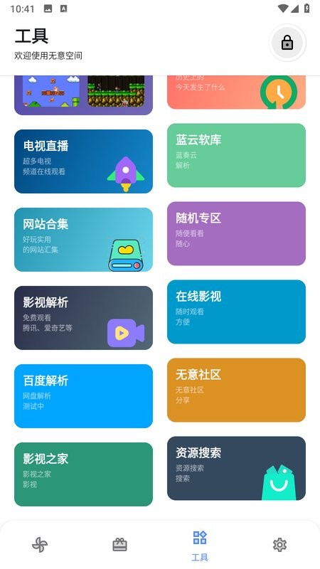 无意空间app拥有着丰富的资源,是好用的软件库平台,通过注册登录即可使用体验。实用软件、影视音乐、小说漫画、游戏娱乐、杂七杂八等随你选择查看,在线下载,还带来各种各样的工具使用,包括音乐搜索器、壁纸大全、小霸王游戏、电视直播、网站合集、百度解析等,全面满足大家需求!