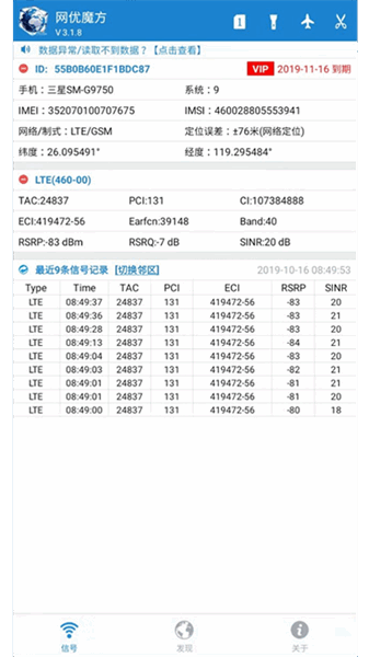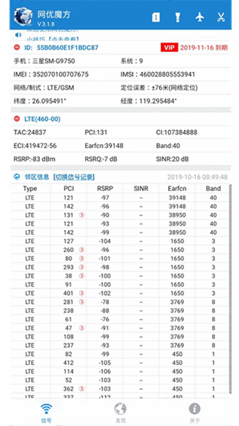 实时采集基站信息,LTE信息包含Tac、Pci、Ci、eNB、CellID、RSRP、RSRQ、SINR。GSM信息包含:Lac、Cid、Sign。在TD-SCDMA模式下可读取Sign。信息记录可以列表方式展现在界面下方,可记录最近100条信息。导入本地现网工参数据,还可以根据基站信息,自动匹配相应基站小区名称、频段频点等,更加直观。同时,展示手机机器码、型号、系统、IMSI、IMEI,网络类型、手机类型及数据链接及活动状态等。
