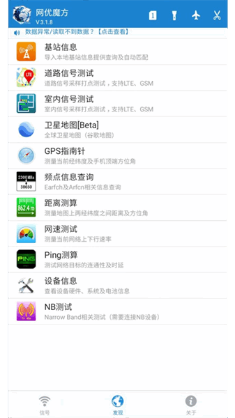 提供常用网优工具入口,包含如下工具:GPS指南针,采用了GPS+Wifi+基站混合定位方式,实现室内外均能准确获取GPS经纬度信息;下倾角测量,测量手机顶端的下倾角及手机顶端所对的方位角;测距工具, 输入两点经纬度或直接点击选取两点,即可获取两点距离及方位角;网速测试,一键测试当前网络的上传及下载速度等。