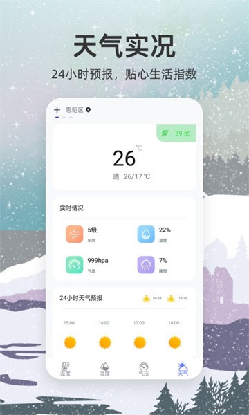 2、天气:实时天气了解,气压、湿度实时情况、24小时天气预报,温馨生活指数。