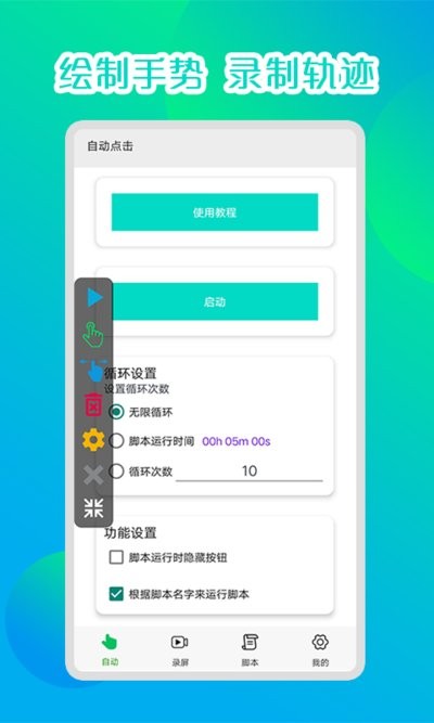 这是一款集自动点击和录屏点击于一体的超级点击器,完成一系列机械动作,使用非常简单,不需要ROOT权限,不需要写代码或者脚本,就可以替代双手自动签到打卡、抢购物券,在手机屏幕界面手势点击模拟器。