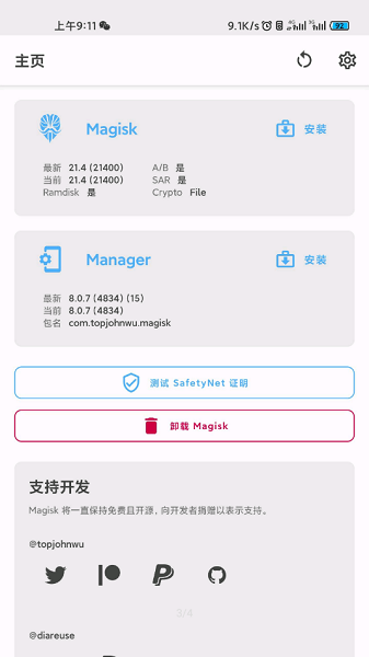 1.安装面具Magisk v19或更高版(华为荣耀/一加 7T/7TPro, 需要 Magisk v20.2+或更高版)