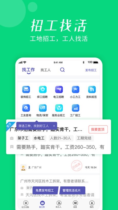 最让我觉得方便的是它可以分项目组管理,这样管理不同工人就轻松多了。还有工地记事本功能,可以把重要的事情提前设置提醒,挺贴心的。最近更新还增加了招工信息标签和生活记账功能,实用性更强了。总的来说,这个软件真的是建筑工人的好帮手!