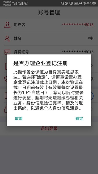 验证通过后,在APP的“账号管理”界面对“是否办理企业登记注册”和“截止日期”选项进行设置。