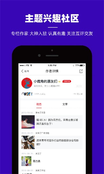 小鹿角app是为热爱音乐的人打造的音乐社区,在这里能够认识非常多热爱音乐的同好朋友;聚合音乐行业细分领域热点资讯,热点文章、数据报告、招聘信息、音乐版权等,全面的内容都有,为用户打造一个价值的音乐社区;参与话题交流,分享自己对流行音乐、音乐剧、嘻哈电音等音乐娱乐领域的见解,和更多人掌上交流,轻松入驻成为专栏作家,在平台参与内容创作;同时,在小鹿角手机版内还包含音乐学院版块,旨在推送在线音视频课程,都是与音乐学习相关的内容,满足音乐爱好者的学习需求。