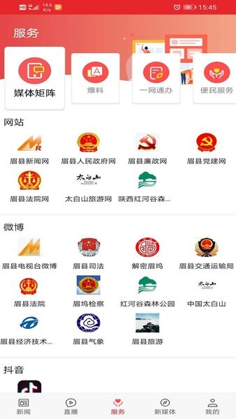 “爱眉县”手机APP作为眉县融媒体中心主办的“新闻+政务+服务”综合APP,是权威的舆论宣传主阵地。开设了新闻、直播、电视、广播、服务、“爱眉县”等栏目,整合了县域内网站、微信、微博、短视频等自媒体和部门、镇(办)、社区、村组政务服务资源。用户可通过客户端,第一时间了解眉县政治、经济、民生、服务等方面的新动态,同时提供各种便民服务,还可参与实时互动,实现“一端在手,尽享智慧”。