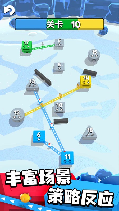 游戏中具有丰富的关卡内容,各类的障碍与道具,提升了游戏的策略性与选择性,玩家可以通过自己的判断规划处最为合理的一条出兵路线,用智慧来领先其他选手!目标只有一个,就是占领所有据点,祝你好运参赛者!