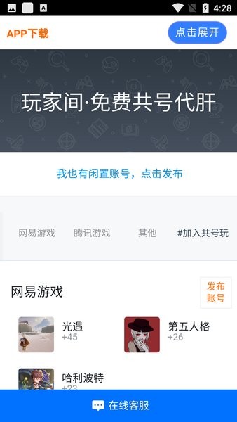 共号玩免费共号平台是拥有非常多玩家在这里共享账号的游戏账号共享平台,让用户可以互相共享自己的游戏账号,许多大神账号在软件之中可以获得,帮助用户轻松的拥有更多游戏的账号。
