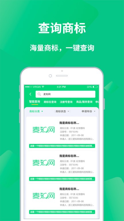 麦知网APP是一款提供商标转让,商标注册,免费商标/专利查询,商标/专利交易,商标/专利监测,商标综合服务等全套商标/专利服务的产品。