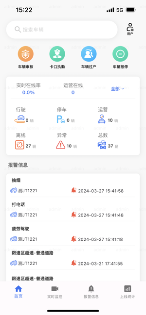 统计并展示车辆上线情况和相关数据。