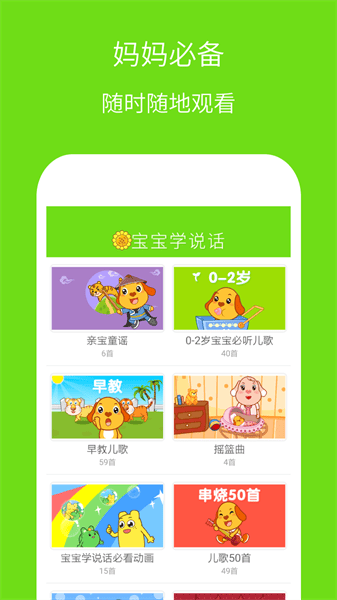 0-3岁宝宝需要多听多看,才可以早日开口说话,感知世界!儿歌大全内容:宝宝学说话必看早教动画片,0-2岁儿歌视频,童谣,早教儿歌,摇篮曲,睡前故事,三字经,弟子规,英文儿歌,学拼音,唐宋诗词等,新增开心布布BUBU3D儿童音乐剧,开心宝贝益智动画、全能宝贝BOBO等内容。