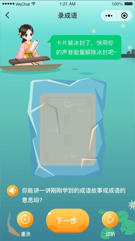 5)三步学习法:趣味生动的音频课程讲解;类游戏的pk动画引导答题练习;成语复述录音的输出学习。