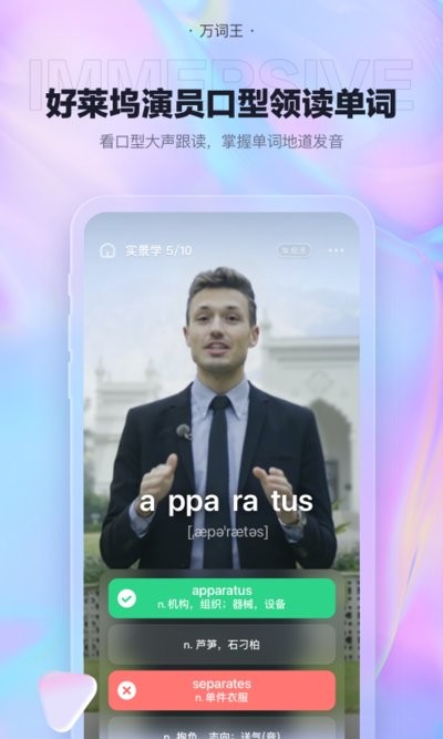 万词王真人实景背单词,学好英语,从读准每个单词发音开始,基于剑桥MFU语言学习理论,邀请好莱坞演员重磅推出视频实景背单词,北美地标实景拍摄,宛如置身于海外生活场景之中,沉入真实语境背单词、练发音、学例句,让大家可以把每个单词都能“听得清、看得懂、说得出、用得准”。