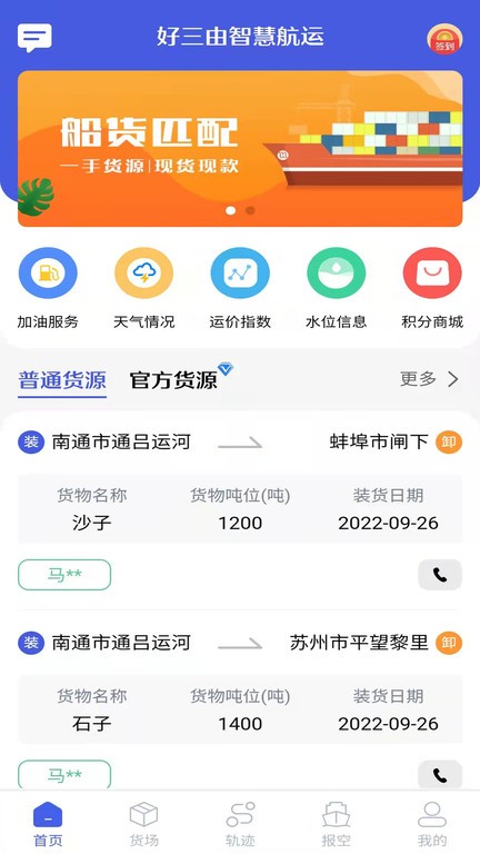 好三由船东版智慧航运交易app适合船东来使用,可以在线查看详细的待承接货源信息,包括普通货源和官方货源,支持在线抢单参与承运,货物的名称、日期以及重量等数据非常之详细,能够便捷的进行船舶管理,还可以查看详细的积分情况。