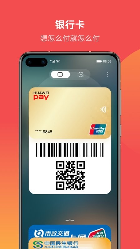 huawei pay银行卡,不开app去支付,支持手机闪付/银联付款码/碰一碰/扫一扫,想怎么付就怎么付,支持超过130余家银行以及千万商户,华为支付消费>2元限时返券火热进行中。