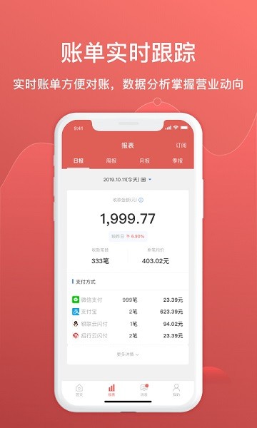3、随时随地查询实时账本数据,报表分析让你了解每日收款变动;