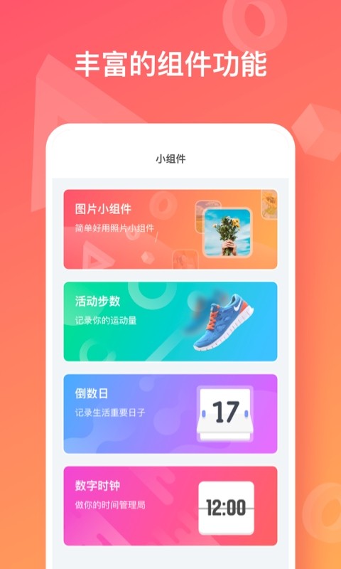 多种多样的小组件,拥有图片小组件、运动步数、倒数日、数字时钟等功能,能够满足您对桌面设计的日常所需。