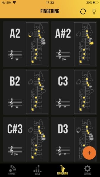 要调用自定义指法窗口,请点击此屏幕右下角的"+"按钮。按下并按住仪器的键,根据您想要的指法超过一秒。
