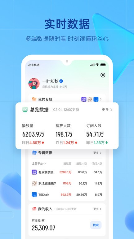 App还支持详细的播放量、人数和订阅数据统计,帮助了解自己的作品表现。海量版权书资源和TME全平台分发的8亿听众让我觉得这是一个很好的机会,能快速接触到更多用户。