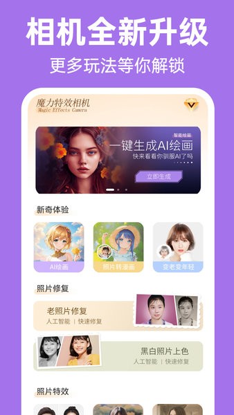 这个魔力特效相机App真的很神奇!它不仅能拍出超好看的自拍照,还能把照片变成漫画风或者复古风,简直像是拥有了魔法一样。最让我喜欢的是它的AI绘画功能,输入文字就能生成画作,感觉像在玩艺术创作一样有趣。