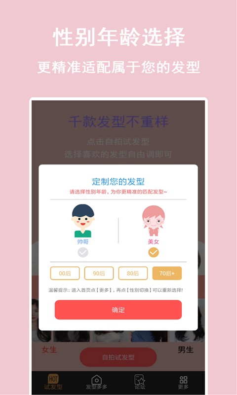 App里还用了智能人脸识别技术,能分析你的脸型和头型,帮你找到最适合的发型。而且还有海量的发型库,包括男生、女生的各种发型,短发、长发、刘海等等,总有一款适合你。如果你对AI推荐的发型不满意,还可以自己挑选,非常方便。