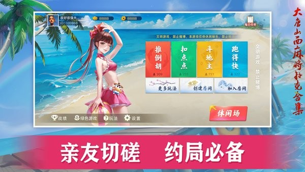 山西大唐麻将是一款由北京棋开德胜科技有限公司开发的休闲娱乐app,专为喜欢棋牌玩法的玩家打造。这款游戏以山西地区的特色玩法为主,比如扣点点、吕梁麻将、长治麻将等,充满了地方风情。游戏内有推倒胡、拐三角、晋中等多种麻将玩法和斗地主、跑得快等扑克玩法,种类非常丰富,满足不同玩家的需求。