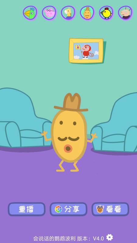 点击顶部的音效头像切换按钮,波利还可以学不同角色的声音说话,然后可以把这只有趣的鹦鹉说话的视频录起来,并分享给您的好友。