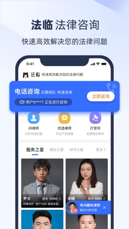 这款法临app真的很方便!它不仅提供全面的法律咨询服务,还能在线找律师,解决各种法律问题。平台上有大量律师入驻,用户可以查看他们的专业领域和经验,选择合适的咨询对象。无论是婚姻纠纷、交通事故还是劳动争议,都能找到对应的解决方案。
