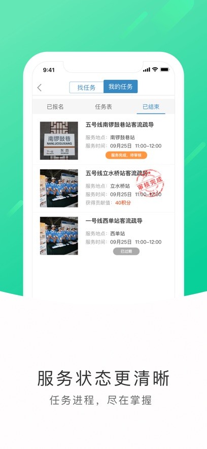 全部任务:实时的推送众多的地铁志愿服务任务,可以查看确切的时间等;