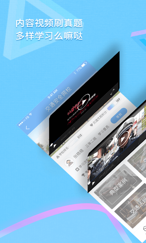 提供交通案例、交警原创、驾考真题演练系统、安全行车等交通安全知识,通过视频、资讯、问答、社区等多种形式,打造学习、互动、分享的交通文明知识学习平台。