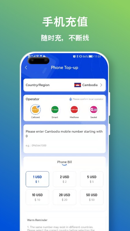 3、手机充值,随时充,不断线