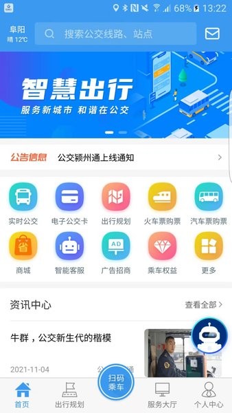 “公交颍州通APP”是阜阳市公共交通总公司面向全体市民推出的一款集“实时公交、出行规划、电子公交卡、火车票购票、汽车票购票、商城、广告招商、乘车权益、服务大厅、智能客服”等功能为一体的智慧出行移动应用。