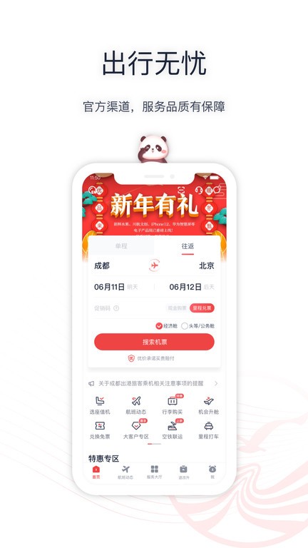 四川航空客户端是川航旗下所推出的一个移动航空服务助手,有了这个软件之后用户就能在这里预订该航空公司的机票,了解其票价以及航行路线,还能实时掌握各种特技机票。关于购票后的服务也能在这里进行,是飞机出行的好帮手。
