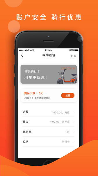 每次出行,我们都将为骑者提供安全保障,责任险、第三者险、综合财产险等多个险种,全方位实现无忧出行。